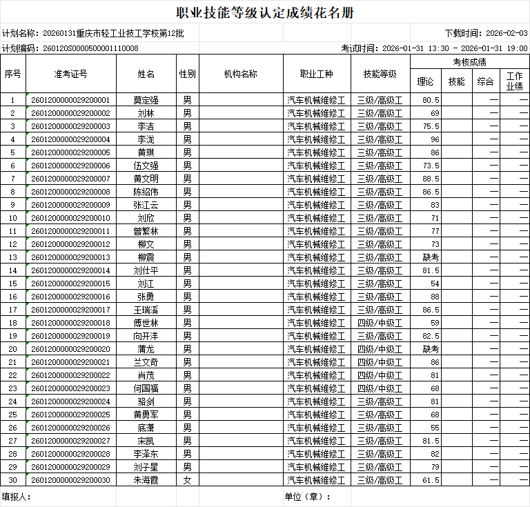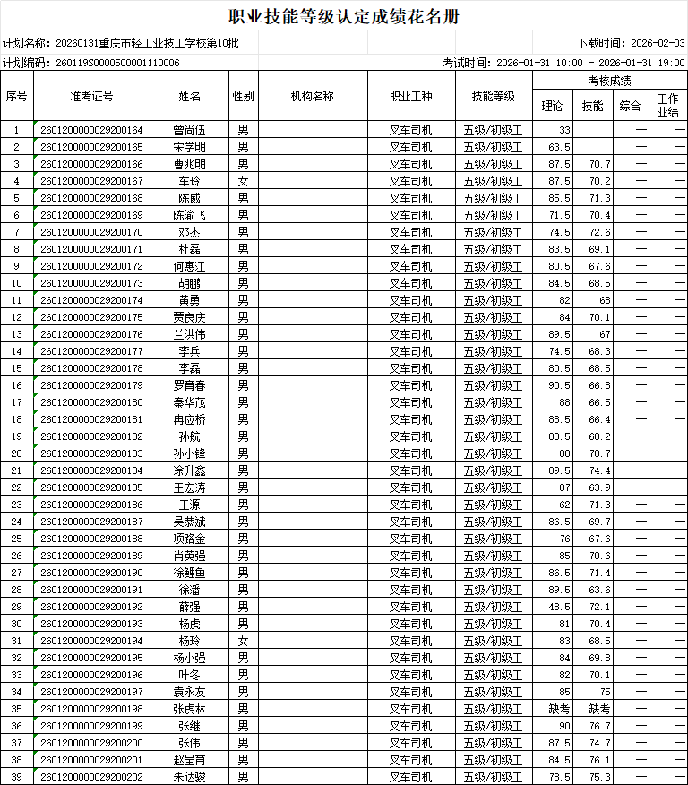根据《重庆市职业技能等级认定考试考务工作规程(试行)的通知》(渝职鉴发[2021123号)文件精神,重庆市轻工业技工学校现将2026年1月31日组织的2个批次共69人职业技能等级认定成绩进行公示(见附件)。公示期为发布之日起计算5 个工作日(即2026年02月04日-2026年02月10日),如对个人成绩有疑问,请在公示期内提出成绩复核申请,公示期结束,不再接受复核申请。 联系方式:雷老师17783053868、艾老师15213320351; 投诉电话023-86089665,邮箱411627445@qq.com