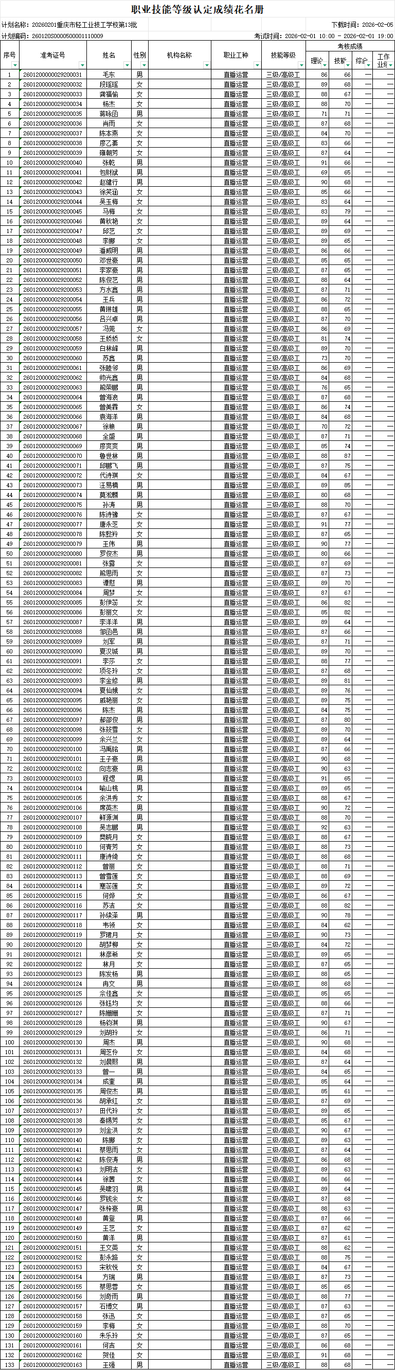 上一篇:职业技能等级认定成绩花名册10批/12批20260131 下一篇:职业技能等级认定成绩花名册14批20260202(璧山考点)