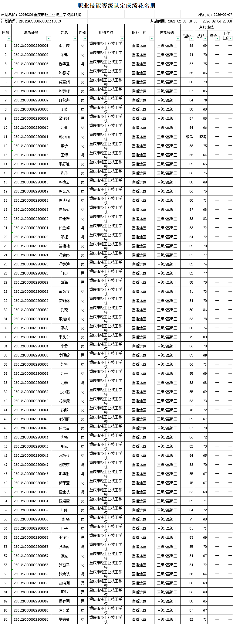 上一篇:职业技能等级认定成绩花名册15批20260203(璧山考点) 下一篇:职业技能等级认定成绩花名册18批20260207