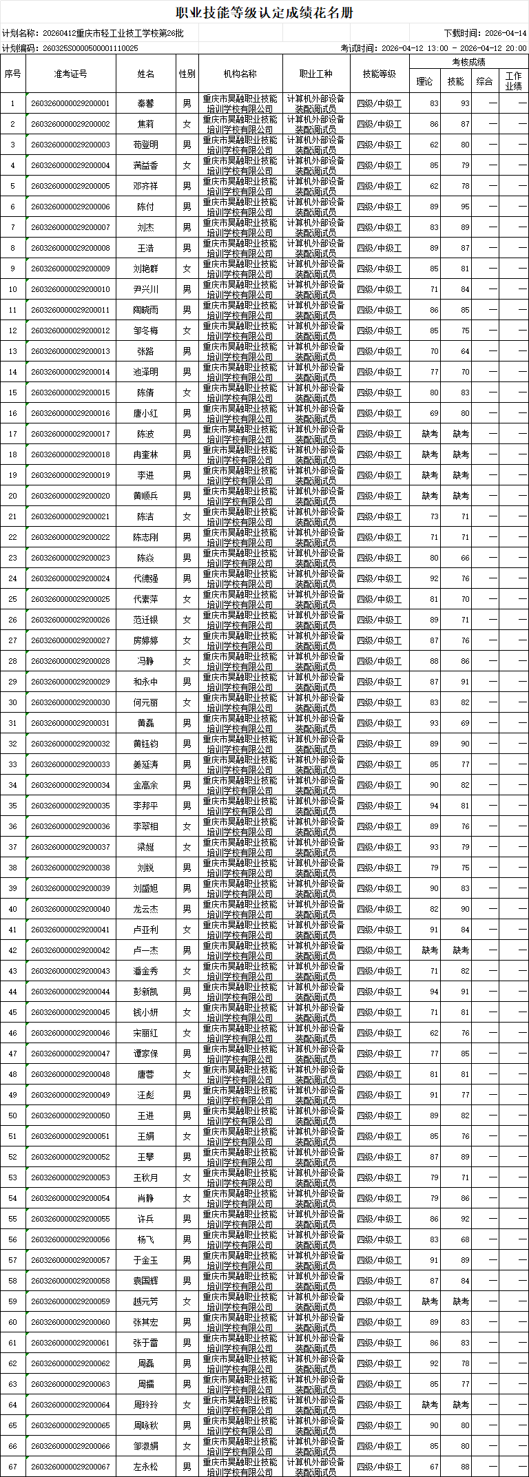 根据《重庆市职业技能等级认定考试考务工作规程(试行)的通知》(渝职鉴发[2021123号)文件精神,重庆市轻工业技工学校现将2026年04月12日组织的1个批次共67人职业技能等级认定成绩进行公示(见附件)。公示期为发布之日起计算5 个工作日(即2026年04月14日-2026年04月20日),如对个人成绩有疑问,请在公示期内提出成绩复核申请,公示期结束,不再接受复核申请。 联系方式:雷老师17783053868、艾老师15213320351; 投诉电话023-86089665,邮箱411627445@qq.com。