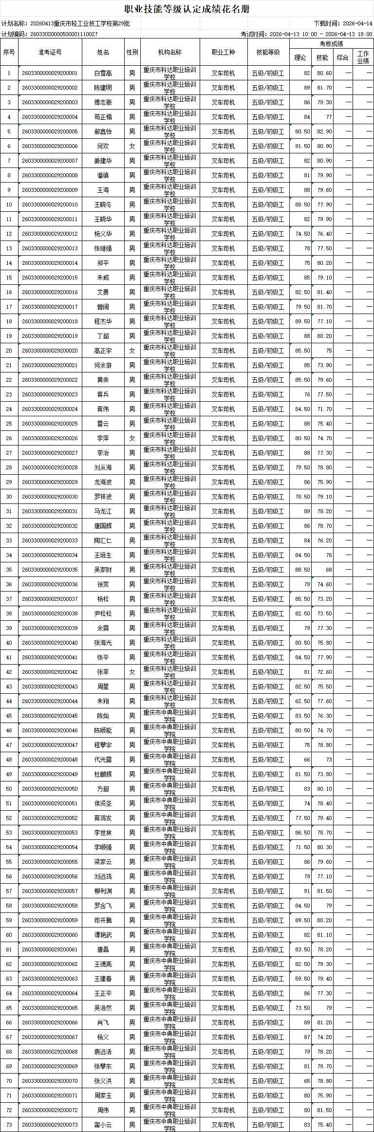 根据《重庆市职业技能等级认定考试考务工作规程(试行)的通知》(渝职鉴发[2021123号)文件精神,重庆市轻工业技工学校现将2026年04月13日组织的1个批次共73人职业技能等级认定成绩进行公示(见附件)。公示期为发布之日起计算5 个工作日(即2026年04月14日-2026年04月20日),如对个人成绩有疑问,请在公示期内提出成绩复核申请,公示期结束,不再接受复核申请。 联系方式:雷老师17783053868、艾老师15213320351; 投诉电话023-86089665,邮箱411627445@qq.com。